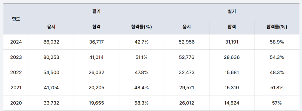 2020~2024 기준으로 필기 합격률은 42.7%~58.3% 범위에서 확인됩니다.