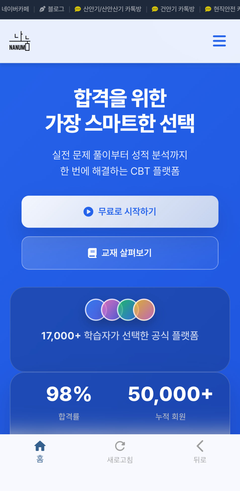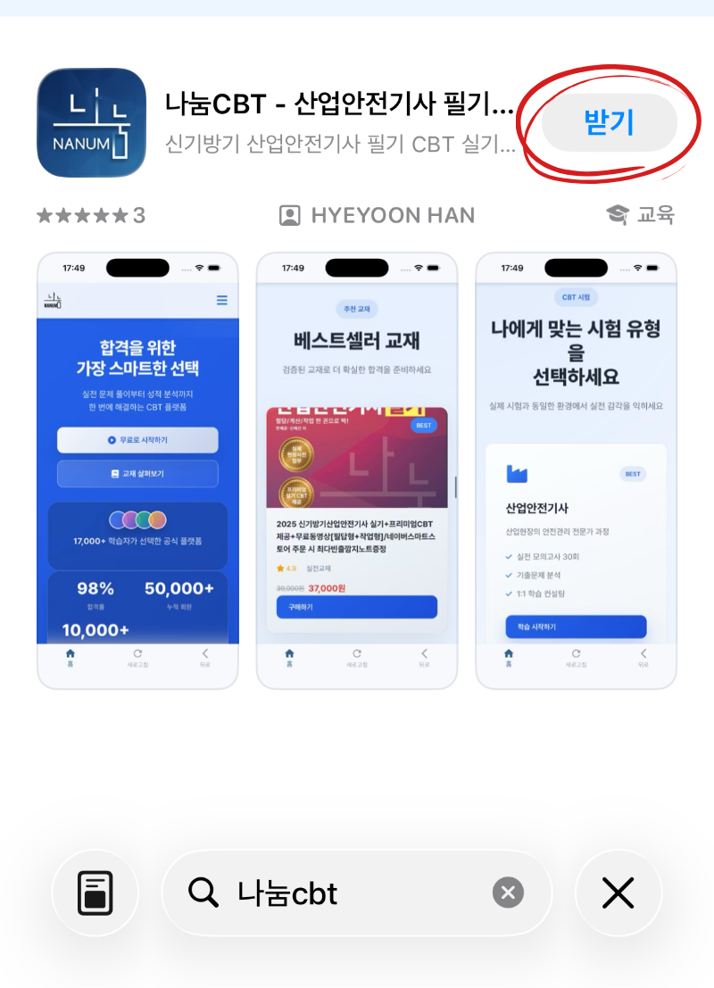 나눔 CBT 어플 설치 방법 (아이폰편) 2026년 03월 08일 조회 107 안녕하세요나눔CBT 앱스토어 어플이출시되었습니다.설치방법을 알려드리도록 하겠습니다!많은 관심 부탁드립니다1. 앱스토어 접속2. 나눔CBT 검색3. 설치4. 설치된 어플 접속이렇게 하시면 완료입니다!컴퓨터 없이도 내손안에 핸드폰에서시험준비를 하실 수 있습니다!많이 푸시면 풀수록 좋으니꼭 1일 1나눔CBT 하시길 바랍니다.