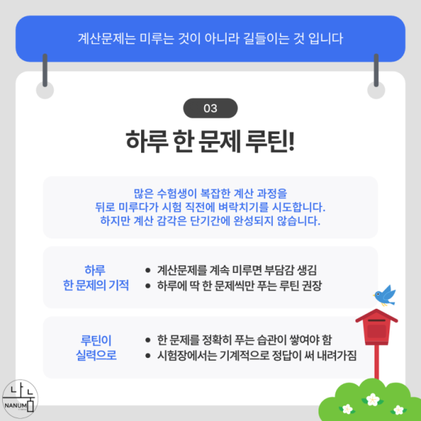 • 하루 한 문제의 기적입니다: 계산문제를 계속 미루면 시험장까지 그 부담감을 안고 가게 됩니다. 하루에 딱 한 문제씩만 푸는 루틴을 가져가시길 권장합니다.